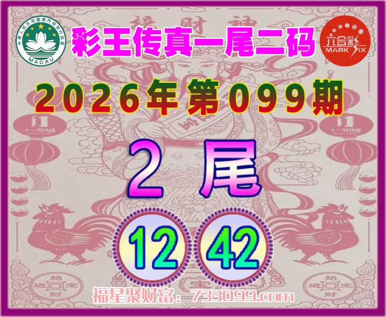 099期:【彩王传真】 ⛩️一尾二码⛩️【2尾主:12.42】开:12准